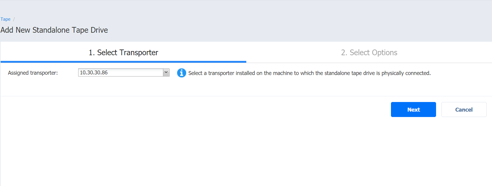 Before adding a new tape drive to NAKIVO Backup & Replication, you need to deploy or add an existing Transporter on a machine that is physically connected to the tape drive. For more information on theTransporter deployment, refer to Deploying Transporter as VMware Appliance and Adding Existing Nodes.
