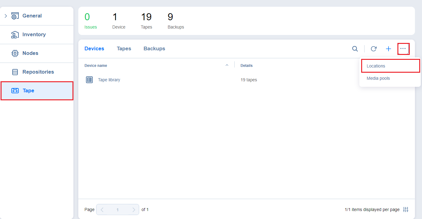 In the Devices or Tapes tab, click the ellipsis Manage button and select Locations. The Location Management dialog box opens.